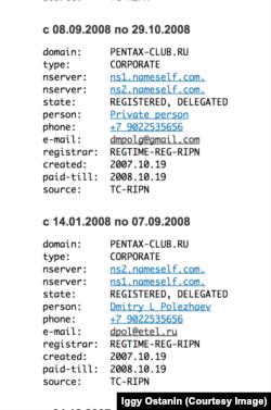 Останину удалось установить, что оба электронных адреса с большой вероятностью принадлежат одному и тому же человеку – екатеринбуржцу Дмитрию Полежаеву. Помог как раз второй, более старый адрес: выяснилось, что домен sinw0t.ru администрировал человек с ящиком dmpolg@gmail.com и мобильным телефоном, оканчивающимся на 656. Администратору с такими же данными в сентябре-октябре 2008 года принадлежал еще один домен – pentax-club.ru, а вот до сентября 2008 года данные владельца pentax-club.ru несколько отличались: мобильный телефон тот же, электронный адрес – dpol@etel.ru, но главное, было указано и имя – Dmitry L. Polezhaev.