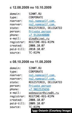 С сентября 2009-го по сентябрь 2010 года в открытом доступе в данных о домене sinwt.ru был указан электронный адрес администратора сайта – dima@sinwt.ru, с октября 2008-го (момент регистрации домена) по август 2009 года – другой адрес, webmaster@sinw0t.ru. В течение короткого периода, с августа по октябрь 2009 года, в регистрационных данных был указан и мобильный телефон, оканчивающийся на 800.