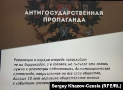 "То же самое с организаторами февраля. У событий 1917 года не было организаторов. Революция вспыхивает стихийно, она предполагает участие представителей широких социальных слоёв, народа, в отличие от переворота, который совершает группа лиц. Революции, как правило, начинаются с мощнейшего социального взрыва, и потом уже к власти приходят какие-то политические элиты. Как, к примеру, Временный комитет Государственной думы, который потом формирует с Петросоветом Временное правительство. Но называть членов Временного правительства организаторами февраля ни в коем случае нельзя, потому что непосредственного участия в событиях 23–25 февраля они не принимали", – говорит Владислав Аксёнов. Тексты про английско-масонское влияние были им вымараны при работе с материалами выставки, все они до сих пор представлены на стендах.