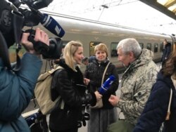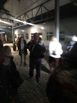 Когда рассветает, становится видно, что состав в Крыму многие действительно ждали. Везде: на крышах гаражей, на отвалах дорожных работ, на путях и перронах – стоят люди. Вот человек с флагом взобрался на крышу своего экскаватора, вот старушка вышла из дверей и одной рукой держит таз, а другой машет проезжающему мимо поезду. Когда при отправлении из Симферополя на вокзале включают "Прощание Славянки", моя соседка-крымчанка еле сдерживает слезы. "Это ведь был мертвый вокзал, здесь все поросло травой. Наверное, вам этого не понять".