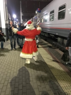 В Ростове-на-Дону длинная, на 33 минуты остановка, интеллигентная женщина из моего вагона собирается встретиться с троюродной племянницей, с которой не виделась 51 год, и с ее сыном, которого и вовсе видела только по телевизору – в "Своей игре". На перроне бодро пляшет Дед Мороз, из динамика на его брюхе звучит песня "Под небом голубым". Смартфоны снимают, собаки нюхают, пассажиры раздают интервью, люди в штатском внимательно наблюдают. Кто-то кричит "Крым наш". В вагоне-ресторане я встречаю моряка, он в той же тельняшке и том же шарфе. "А знаешь, почему я так одет? Тельняшка – понятно, а итальянский шарф символизирует, что у нашей страны огромный потенциал". За вчерашний день морячок почему-то уверился, что я работаю в ФСБ, и отпускает намеки: "Хорошо, что ты тут следишь за безопасностью, такие как ты, молодые, дадут отпор врагу, дадут ведь? Смотри, много не пей! У тебя хороший удар с левой? Дашь врагу с левой?" Мои возражения еще больше укрепляют его уверенность, я решаю ретироваться, и моряк, подмигивая, хлопает меня по плечу: "Понятно, тебе отчет писать надо". Я ничего не говорю, тем более что он отчасти прав – мне надо писать репортаж.