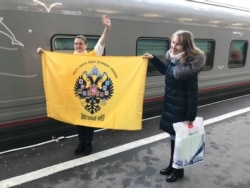Поезд заполнился, хотя и не целиком – примерно треть верхних полок в плацкартах пустует. Люди распихивают чемоданы, почти каждый перевязан георгиевской ленточкой. В проходе сталкиваюсь с молодым человеком в инвалидном кресле – я предлагаю придержать дверь в тамбур, но он с грустной улыбкой отказывается: "Спасибо, но туда я проехать все равно не смог". Еще одна инвалидная коляска в другом вагоне, ее некуда пристроить: "Что-то они не предусмотрели". Сложенное кресло в итоге запихивают под полку, оно торчит на половину прохода, но никто не расстроен: все вокруг смакуют торжественный момент. "Историческое событие", "Мы первые", "Наконец-то" – доносится с разных сторон. Многие смотрят на смартфонах уже вышедшие в эфир телерепортажи, кто-то рассылает родственникам ссылку на собственное интервью телеканалу "Россия".