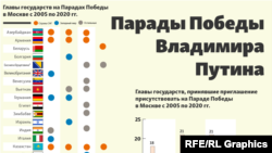 На парад, который планировалось провести 9 мая, собирались приехать существенно больше зарубежных лидеров, в том числе президенты Франции, Чехии и Хорватии. Парад, однако, перенесли из-за эпидемии коронавируса, и многие зарубежные гости отказались от визита. Лидеры других государств, в том числе президент США Дональд Трамп, отказались и от первоначального приглашения на парад 9 мая. Песков сказал, что в Кремле "с пониманием" относятся к позиции зарубежных лидеров.