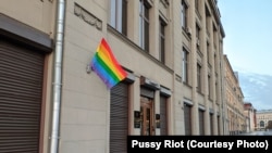 Речь идет об акции против гомофобии, которая прошла 7 октября 2020 года – в день рождения президента России Владимира Путина. Участники Pussy Riot развесили радужные флаги – символы ЛГБТ-сообщества – на зданиях разных ведомств, среди них администрация президента, ФСБ, ОВД "Басманный", Министерство культуры и Верховный суд.