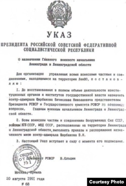 О выходке Собчака немедленно узнали в Москве – сессия транслировалась. Через некоторое время позвонил Руцкой и стал орать на меня, что мы исказили Указ. Я вызвала из зала Александра Беляева, который лишь констатировал факт искажения Указа Президента. Вскоре появился второй Указ № 68 от 20 августа 1991 г. (взамен разосланного), который так и назывался: "О назначении Главного военного начальника Ленинграда и Ленинградской области". Личной подписи Бориса Ельцина на нем не было.
