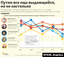 Советский диктатор Иосиф Сталин остаётся самой популярной исторической личностью среди россиян почти десять лет. Так считают 39 процентов респондентов, следует из результатов последнего опроса "Левада-центра" (внесён российскими властями в список "иностранных агентов"). Показатель же Владимира Путина за четыре года с последнего аналогичного опроса упал более чем вдвое – с 34 до 15 процентов. Президент России занимает пятую строчку в списке.