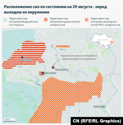 20 августа пресс-служба Нацгвардии Украины заявила о контроле над городом – это была неправда. Под контролем украинских добровольцев была лишь западная половина города.