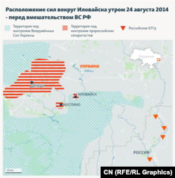 24 августа четыре российские батальонно-тактические группы общей численностью четыре тысячи человек вторглись на территорию Украины в районе Иловайска, восточнее и южнее. У них имелось до 20 танков, до 90 бронемашин, до 30 артиллерийских систем и до 20 РСЗО.