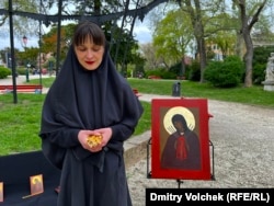 Вечером, после закрытия Биеннале, я знакомлюсь в сквере с русской девушкой в костюме монахини. Она предлагает мне свечу и показывает свою работу: икону Семистрельной Богородицы, перед образом которой следует просить о примирении враждующих. Художница не хочет называть своего имени, потому что иконописцам следует сохранять анонимность, говорит только, что приехала в Венецию из Будапешта. "Радио Свобода? – удивляется она. – Неужели вас еще не закрыли?" Но пока в Венеции закрыты только российский павильон и роскошный выставочный зал, принадлежащий фонду V-A-C российского миллиардера Михельсона. Кое-где на стенах висят плакаты с призывом полностью отменить империалистическую российскую культуру. QR-код ведет на манифест, авторы которого советуют переключить внимание на культуру украинскую. На Биеннале это уже произошло.