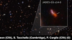 Американское космическое агентство НАСА и Европейское космическое агентство показали фотографию самой удалённой из известных галактик, сделанную инфракрасным космическим телескопом "Джеймс Уэбб". Галактика JADES-GS-z14-0 существовала спустя 290 миллионов лет после Большого взрыва.