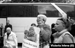 Другая стоит прямо возле автобуса с вернувшимися из плена, держит фотографии мужа, на них только лицо крупным планом.