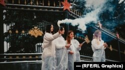 Четыре активистки вышли в белых костюмах биологической защиты с надписями No Nukes ("Нет ядерным боеприпасам") к зданию министерства в центре города у метро "Арбатская" и зажгли фейерверки.