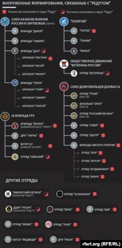 Журналисты "Системы" выявили более 20 различных отрядов, которые нанимают людей через так называемую ЧВК "Редут". Среди них группировки, связанные с 16-й бригадой спецназа ГРУ (упомянутые выше "Волки", а также "Тигры"), казачьи формирования ("Листань" и "Скиф"), подразделения "Союза Добровольцев Донбасса" ("Бригада Святого Георгия") и отдельные формирования вроде "Трои" и "Ветеранов". Кроме того, до конца 2022 года по системе "Редут" комплектовалась неонацистская группировка "Русич".