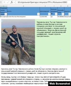 В базе упоминаются и военные, о которых писали СМИ: например, уроженец Новолакского района Дагестана Мухтар Алиев, который, как сообщало в декабре 2022 года издание "Голос времени", попал под обстрел и сумел спастись. База ГВМУ позволяет узнать, что он был ранен месяцем ранее, в середине ноября, и был госпитализирован с диагнозом "Закрытый перелом костей носа" в 419-й военный госпиталь в Краснодаре. Из базы данных следует, что Алиев, как и еще более ста человек, информация о которых есть в документе, служил в военной разведке, в 10-й отдельной бригаде спецназа ГРУ, дислоцированной на хуторе Молькино Краснодарского края.