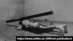 – Я не получил образования в области искусств. Я много чего прочитал, но, конечно, не все понял. Понял я вот что: чтобы человек что-то высказал, можно использовать тело. И мои первые акции были с этим связаны, когда я таскал камни, привозил их в Прагу. Тогда сразу понимаешь, что тело – это не только инструмент, но и материал. Кто-то использовал для создания искусства дерево, а я – тело, которое воспринимал как равнозначный дереву материал. Конечно, не только тело. У меня были разные акции, какое-то время меня очень занимала коммуникация. Поэтому я слушал радио, а в девять всегда сообщали уровень воды в чешских реках. Я это записывал, а потом рассылал знакомым по почте. Интересно, что это никогда ни у кого не вызвало подозрений, хотя это могло быть зашифрованное сообщение. Так это интерпретировали в одной искусствоведческой книге, которая недавно попала мне в руки. Я рассматривал в том же коммуникативном ключе свои акции с газетой Rudé právo, и когда читал главу из книги о польской истории. Была еще одна интересная вещь, когда я на чердаке дома в Старом городе [район Праги] делал перформанс "Спартакиада". Мне он кажется одним из самих интересных из тех, что я организовал. К сожалению, почти не осталось фотографий. Я работал в музее, и там было огромное количество большевистских плакатов, которые я собрал на этом чердаке, развесил, их было 30 или даже 40, и пригласил людей на псевдовечеринку. Там была пара бутербродов, но это была ирония, потому что я купил банку искусственной икры. Я включил радио, передавали в прямом эфире спартакиаду. Люди разговаривали, и я иногда увеличивал громкость, чтобы не болтали, а потом делал потише. Это была чистая случайность, но началась невероятной силы гроза с ливнем. В этот момент выступали военные, и они просто тонули в грязи, а комментатор обо всем этом рассказывал. Меня в этой истории занимало то, как можно передать визуальное впечатление и таким вот словесным образом. Конечно, когда речь идет о футбольном матче, это похожая история – описание того, что делают спортсмены. Но тут была спартакиада, и это были невероятные комментарии, как люди создают своими телами пирамиды: становятся в круги, залезают друг на друга, падают. Да еще и вокруг сплошная грязь, а комментатор битый час об этом подробно рассказывает, какие прекрасные наши военные и тому подобное. Это была одна из лучших моих вещей, частично основанная на случайности, хотя именно из-за спартакиады я и принес туда радио. Я старался со случайностью немного работать, потому что, конечно, никогда не знаешь, как перформанс закончится.